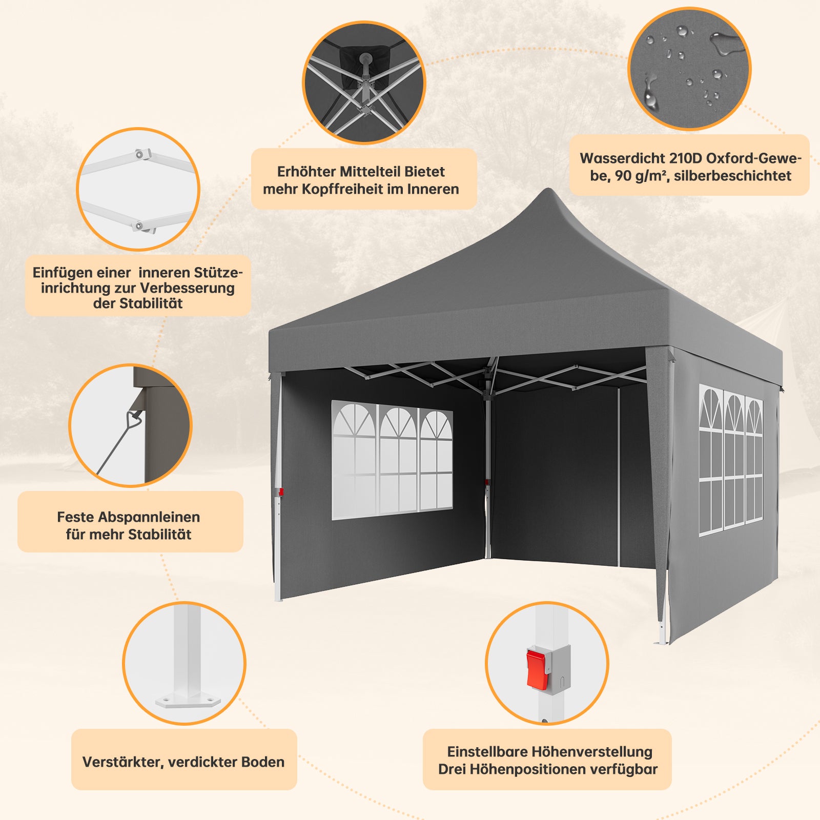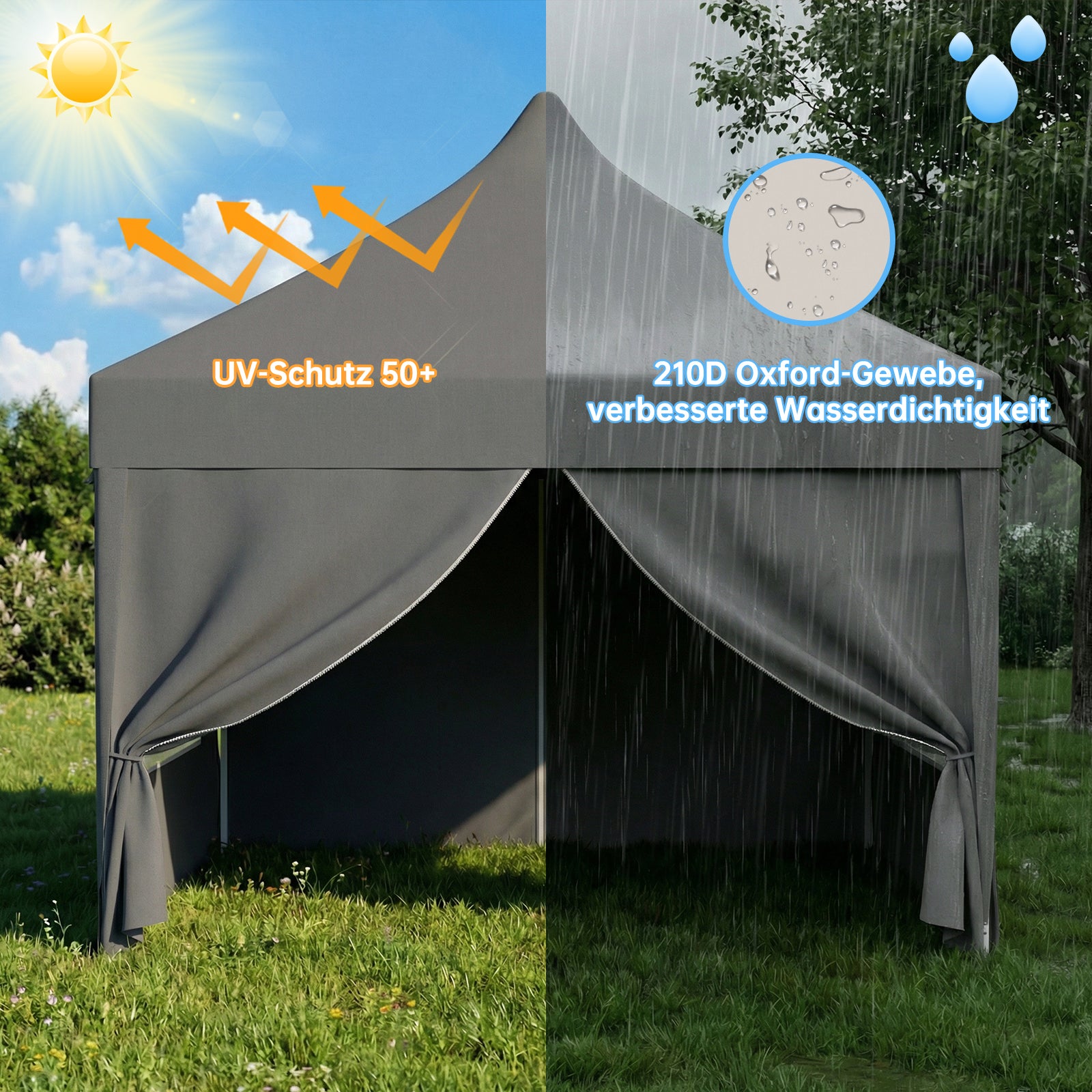 Das hochwertige Zeltmaterial bietet zuverlässigen Schutz vor intensiver Sonneneinstrahlung und ist gleichzeitig wasserdicht. So bleiben Sie auch bei wechselhaftem Wetter angenehm kühl und trocken – ideal für Garten, Terrasse oder Outdoor-Events.