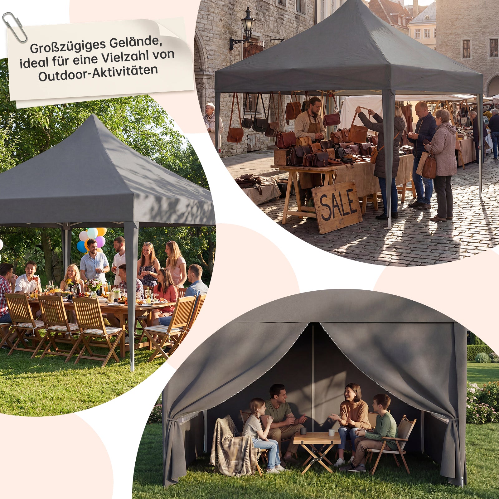 Dieses Zelt ist vielseitig einsetzbar und eignet sich perfekt für Marktstände, Familienfeiern sowie Treffen mit Freunden. Es bietet zuverlässigen Schutz vor Sonne und leichtem Regen und schafft einen geschützten, komfortablen Bereich für Verkauf, Essen oder gemeinsame Aktivitäten. Dank des schnellen Auf- und Abbaus ist es flexibel einsetzbar – sowohl für private als auch für gewerbliche Zwecke.