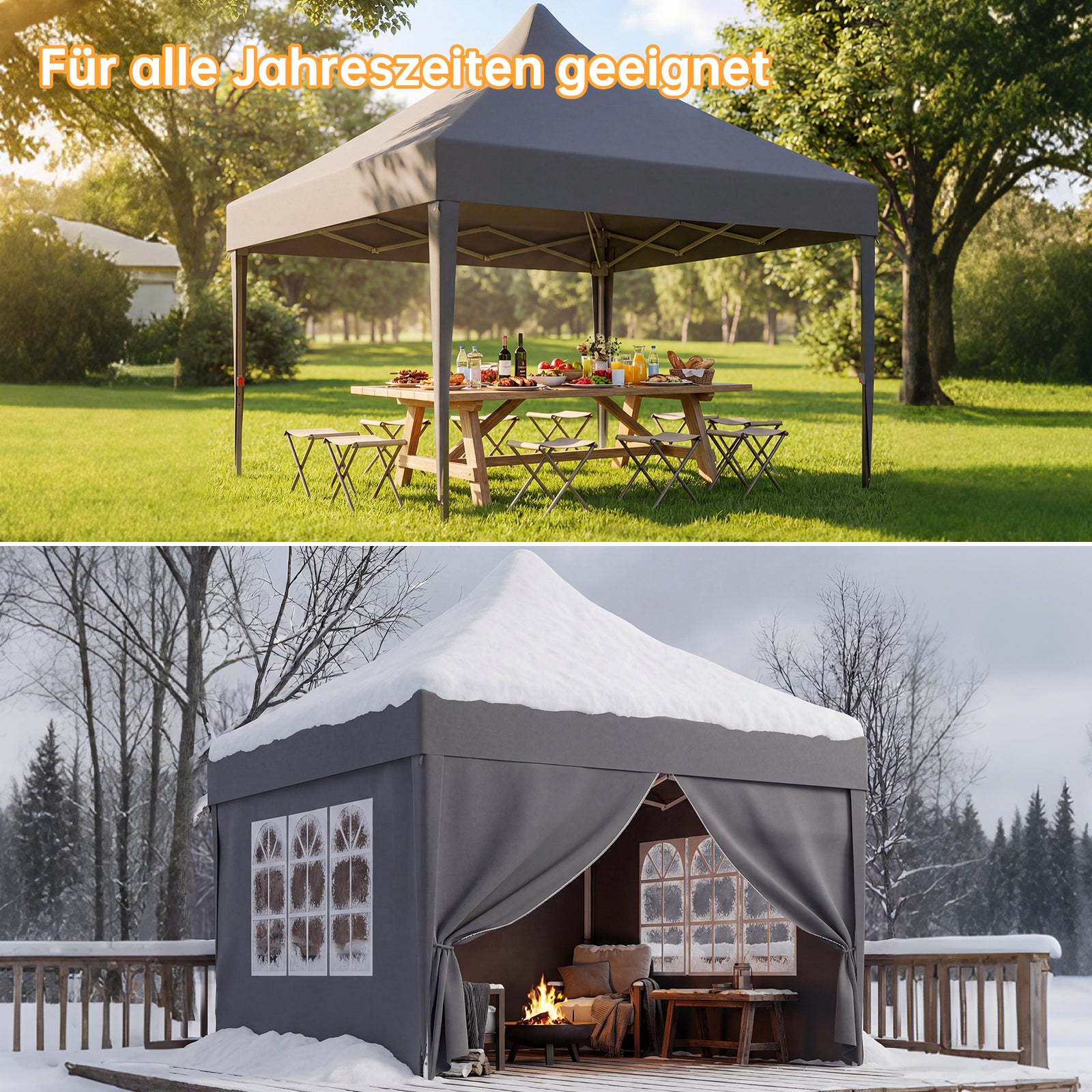 Dieses Zelt ist für den Einsatz von Sommer bis Winter konzipiert. In der warmen Jahreszeit bietet es angenehmen Schatten und optimale Belüftung, während im Winter die abnehmbaren Seitenwände montiert werden können, um effektiv vor kaltem Wind zu schützen. So bleibt der Innenraum auch bei niedrigen Temperaturen komfortabel und geschützt – ideal für den ganzjährigen Einsatz im Freien.