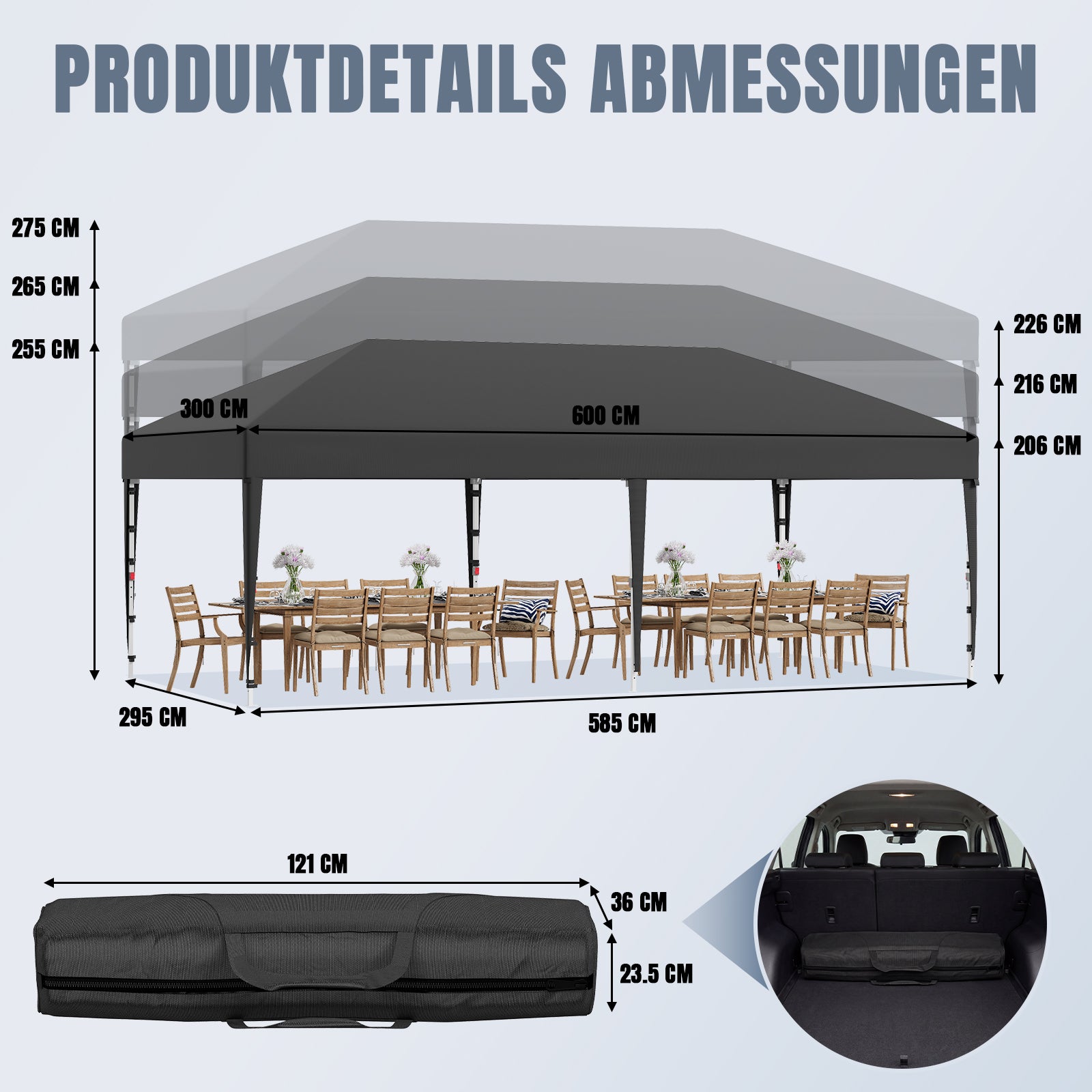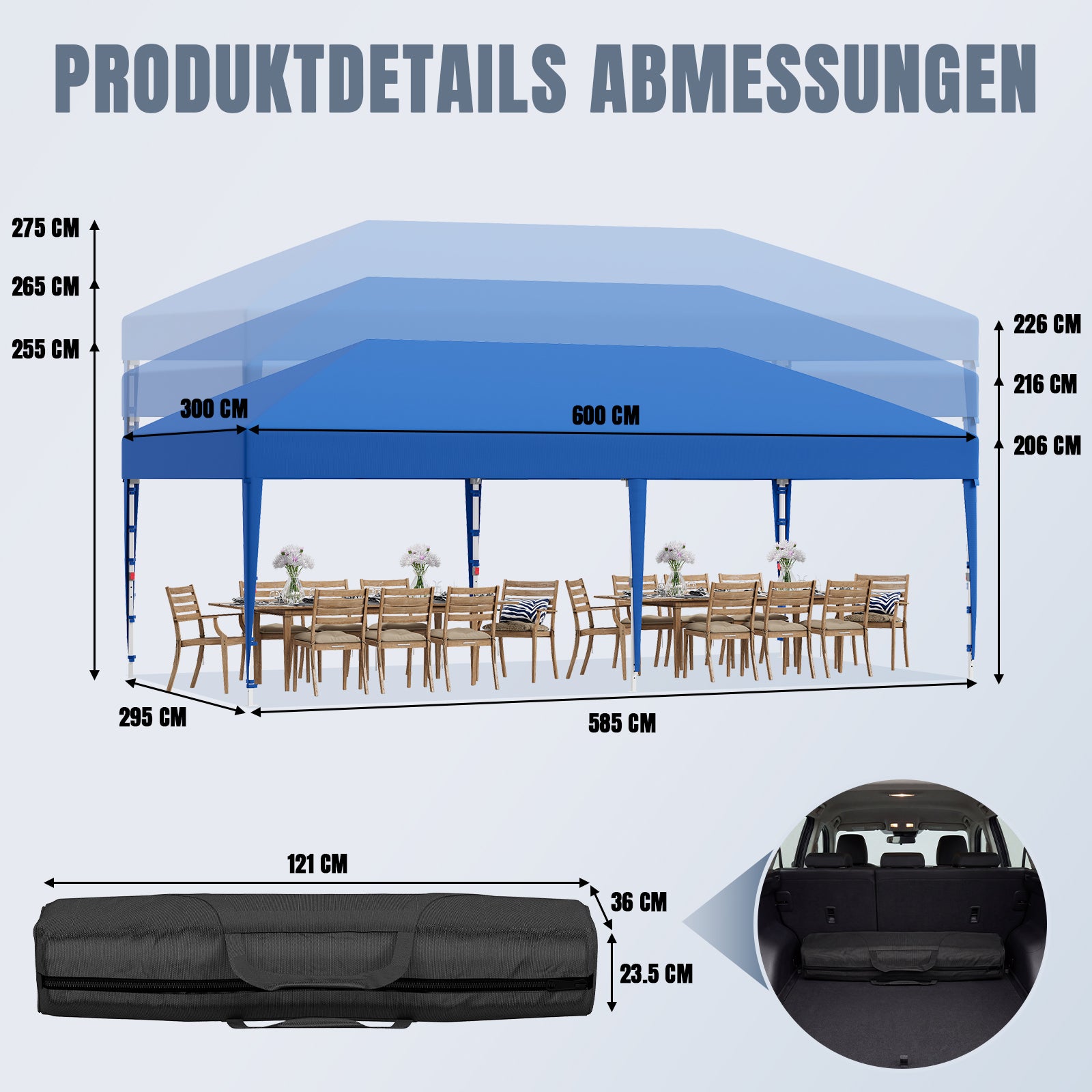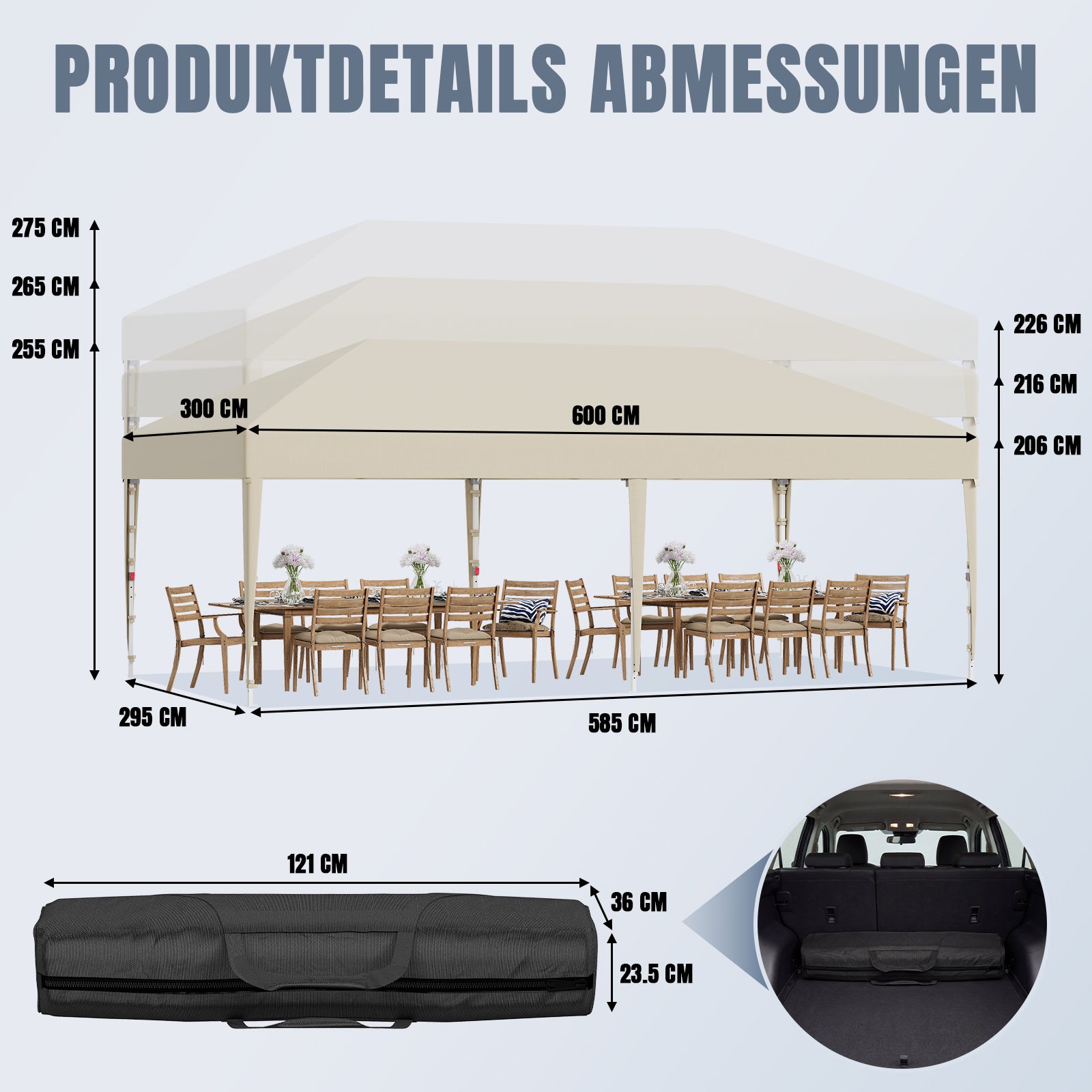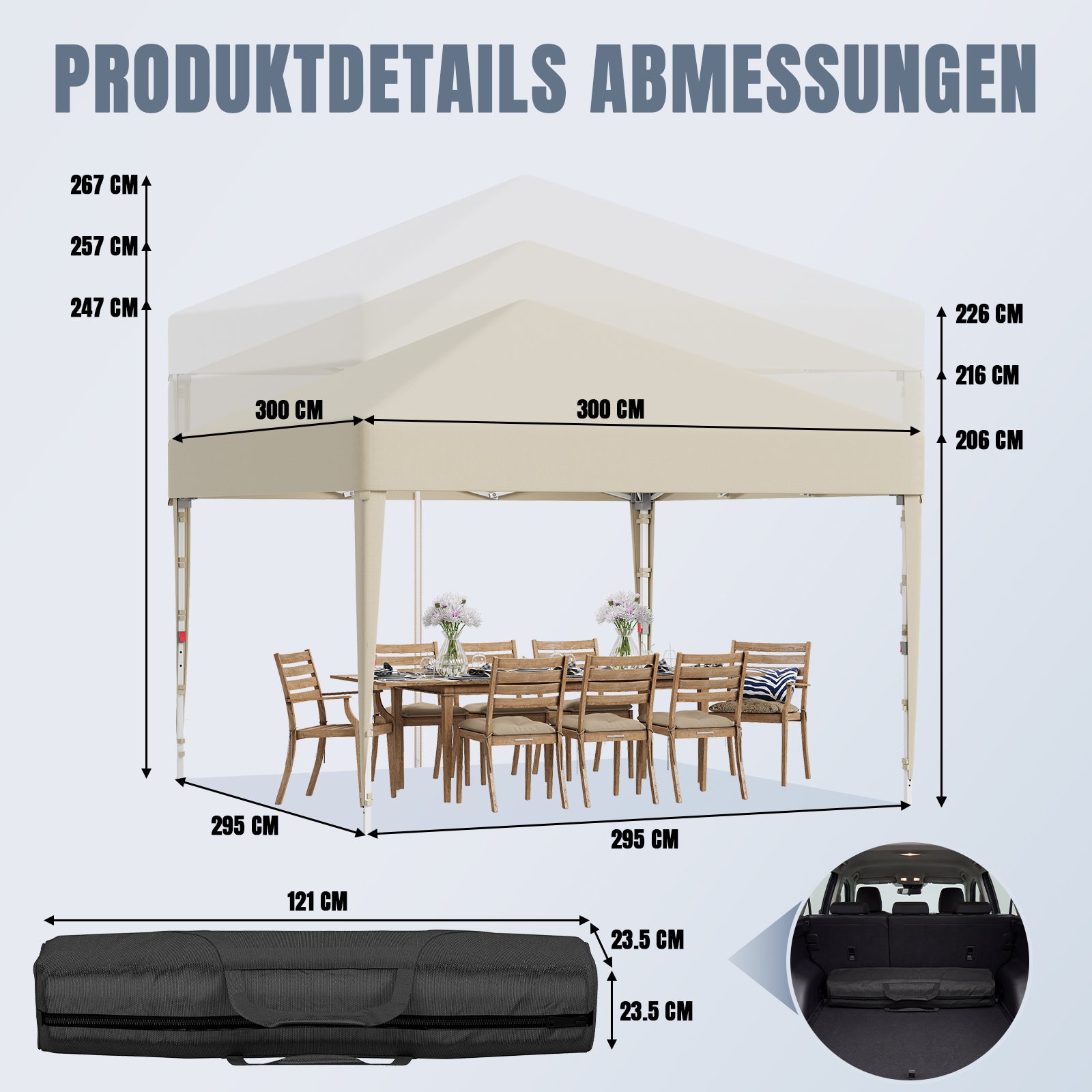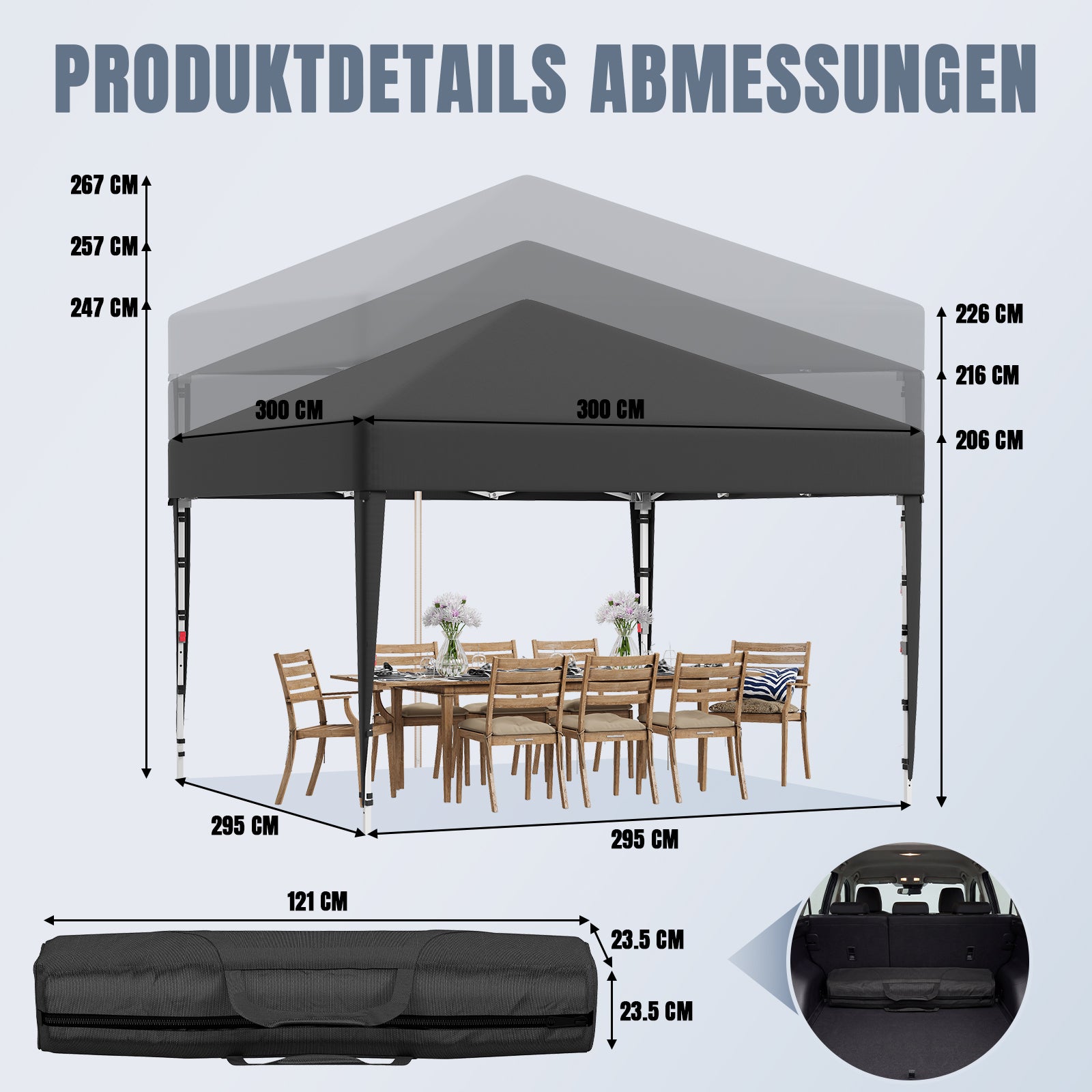 Das hochwertige Zeltmaterial bietet zuverlässigen Schutz vor intensiver Sonneneinstrahlung und ist gleichzeitig wasserdicht. So bleiben Sie auch bei wechselhaftem Wetter angenehm kühl und trocken – ideal für Garten, Terrasse oder Outdoor-Events.